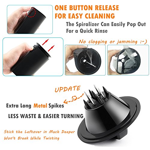 【ONE-BUTTON RELEASE FOR EASY CLEANING】 Press the release button the spiralizer will pop out for a quick rinse. No clogging or jamming. Process is simpler and time-saving for washing our spiral slicer. A cleaning brush included can get between the blades and scrub it to keep sanitary. [Dishwasher Safe].