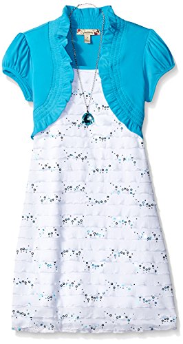 Knee length mock 2fer eyelash dress with a shrug and necklace