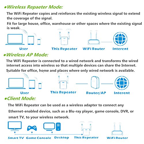 ---Fast & Easy to Setup---Intelligent Signal Indicator(3 Colors:Blue,Green and Red).Helps you find the best location for the repeater.No App, No driver DVD needed. Detachable & Convenient wall-plug design,Work with any Wifi router or gateway.