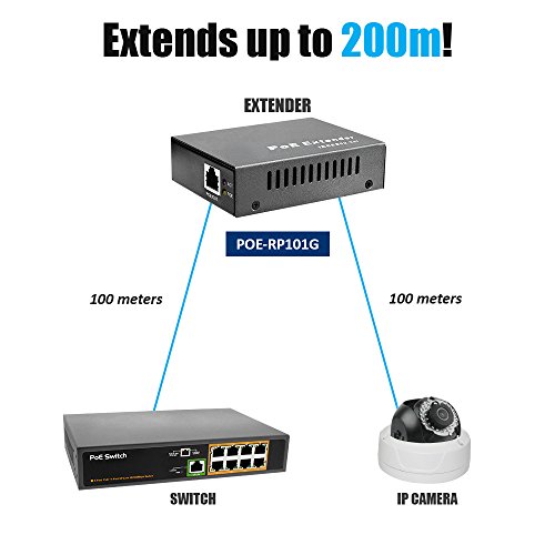 The BV-Tech POE-RP101G is a single port Gigabit POE+ extender that allows you to double the standard run distance of 100m (~330ft) to 200m (~660ft).