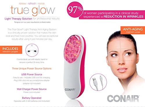 Renew. Refresh. Revive. Introducing the True Glow Light Therapy Solution for professional results anti-aging treatment. Why LED? Soothing light therapy helps to reduce and reverse the fine lines and wrinkles that can age your skin. In just minutes a day, this unique LED treatment can also help reduce dark spots, leaving skin looking brighter and more youthful. This tool is dermatologist recommended and clinically proven to enhance overall skin color, texture and tone. Ideal for dark spots and brightening to reveal youthful and healthy - looking skin! Provides fast and safe results that can be used on all skin types and is safe for everyday use. USB power source - USB cord included and is easy to use for charging. Wall charger power source cord also included. Battery operated - 3 AA batteries need but not includedFeature