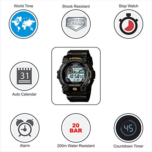 Brand, Seller, or Collection Name:Casio Model number:G-7900-3DR Part Number:G-7900-3DR Model Year:2014 Item Shape:Round Dial window material type:Mineral Display Type:Digital Clasp:Buckle Case material:Resin Case diameter:49 millimeters Case Thickness:16 millimeters Band Material:Resin Band length:Mens-Standard Band width:28.5 millimeters Band Color:Army Green Dial color:Grey Bezel material:Resin Bezel function:Stationary Calendar:Day, date, and month Special features:Shock resistant Movement:Quartz Water resistant depth:660 Feet