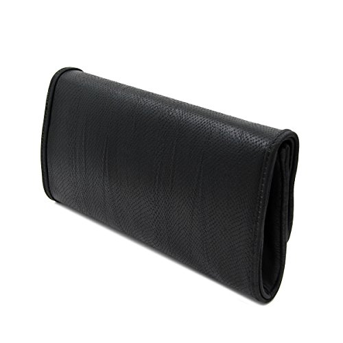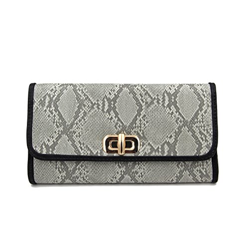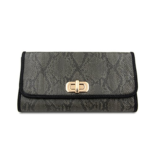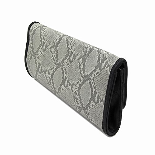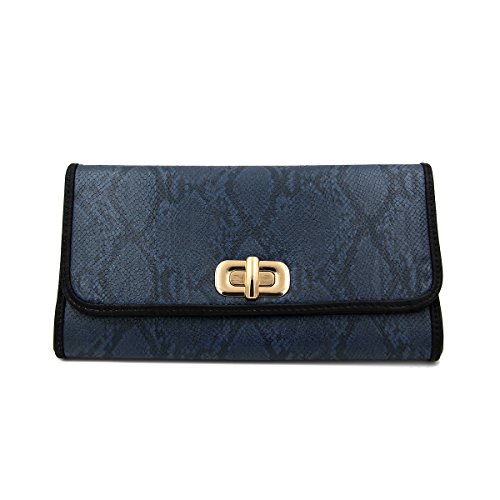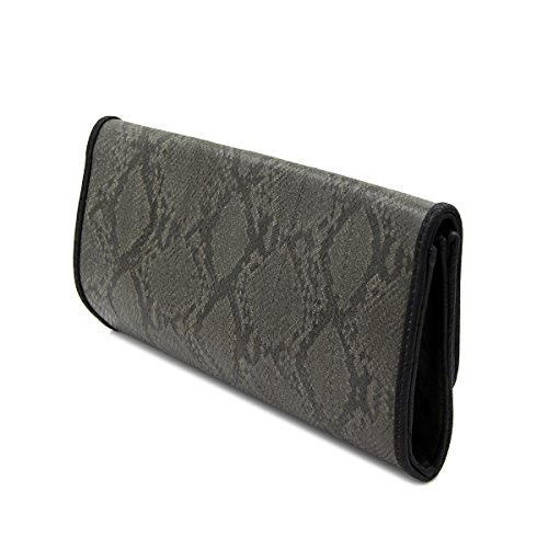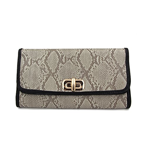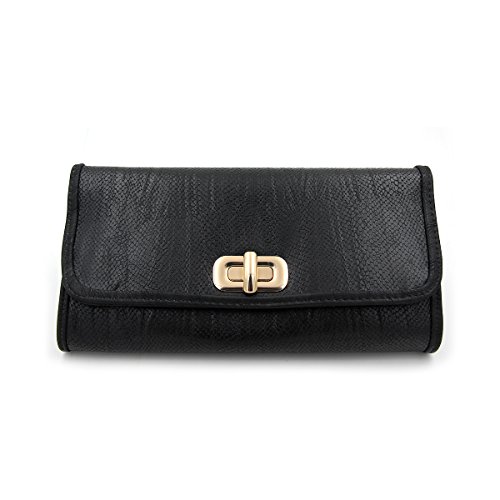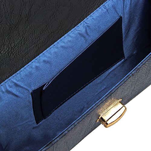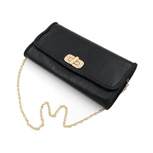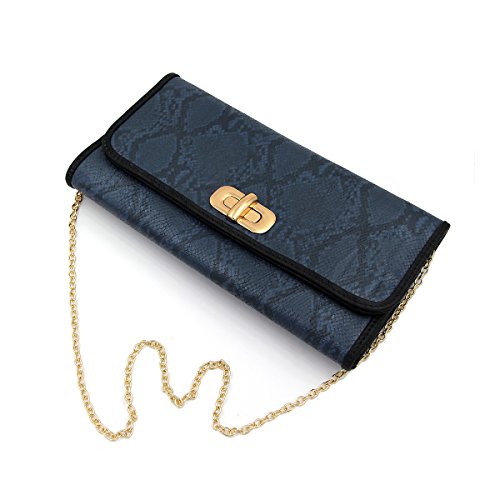 Product Description This high quality PU leather clutch is both unique and stylish. Detailed snakeskin leather pattern feel complete the fashionable look. Fully lined with inner wall pocket and turnlock flap closure. Gold tone hardware. Removable hideaway shoulder chain strap with 22" drop. Stunning, functional and versatile. The size is 12" (L) x 6.5" (H) x 2" (W). Elegant design and luxury feel. A must have accessory for the perfect night out. 0