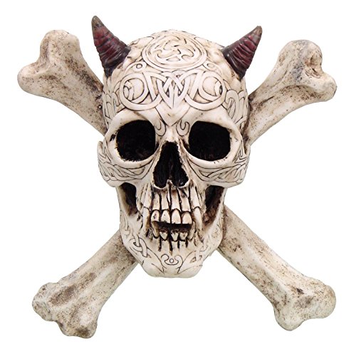PTC Devil Horned Skull Cross and Bones Resin Statue Figurine, 10" H