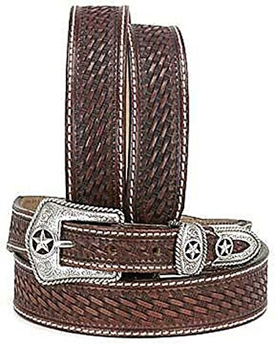 Product Description The Justin Lone Star Hand Tooled Belt is a fancy basket weave leather belt that is 1 1/2" tapered to a 1" billet. It features a removable Lone Star three piece buckle set 0