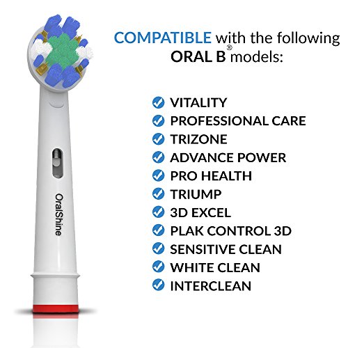 -. Feature : ✔ PREMIUM QUALITY ORAL B REPLACEMENT TOOTHBRUSH HEADS: If you have just purchased your electric Oral B toothbrush and you are looking for the perfect replacement heads, then we got you covered. We have the ultimate Oral B replacement toothbrush head set of 4 that will serve all of your brushing teeth needs to the fullest. BONUS: We're also including a FREE set of 4 soft bristles. / ✔ COMPACT TOOTHBRUSH HEADS FOR OPTIMAL TOOTH COVERAGE: You can now smile again and keep your teeth crystal clear with our compact toothbrush heads. Their high quality bristles will fit on the natural shape of each and every single one of your teeth, without feeling bulky at all. Get ready for some dental professional care with these replacement toothbrush heads. / ✔ TOOTHBRUSH HEADS FOR PLAQUE REMOVAL & GINGIVITIS DECREASE: OralShine has designed these Oral B toothbrush heads to protect your teeth to the maximum. Their ergonomic design will remove plaque and decrease the chance of gingivitis unlike manual toothbrushes. You can rest assured that your teeth are in good hands. / ✔ GREAT COMPATIBILITY WITH ORAL B ELECTRIC TOOTHBRUSHES: Our 4 regular toothbrush heads are compatible with most Oral B rechargeable toothbrushes. Is it Oral B professional care 1000, 8500 or 600? You name it and our removable heads will fit perfectly without any issues. Brushing your teeth has reached another level! / ✔ THE ULTIMATE 4 & 4 REPLACEMENT TOOTHBRUSH HEAD SET: Along with the 4 regular toothbrush heads, you will be offered 4 bonus heads with soft bristles. And all these in simply one OralShine package. These toothbrush heads are ideal for women, men and kids that pay extra attention to their oral hygiene and hate spending a fortune at the dentist's office.