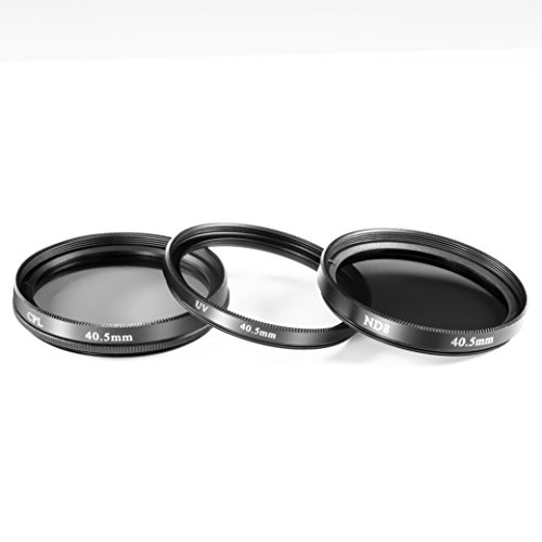 Kit includes: (3) 40.5mm Filters (UV + CPL + ND8) + (1)Filter Carrying Pouch. The filters are heat-treated and multi-coated for optimal quality and protect your lenses from dust and scratches