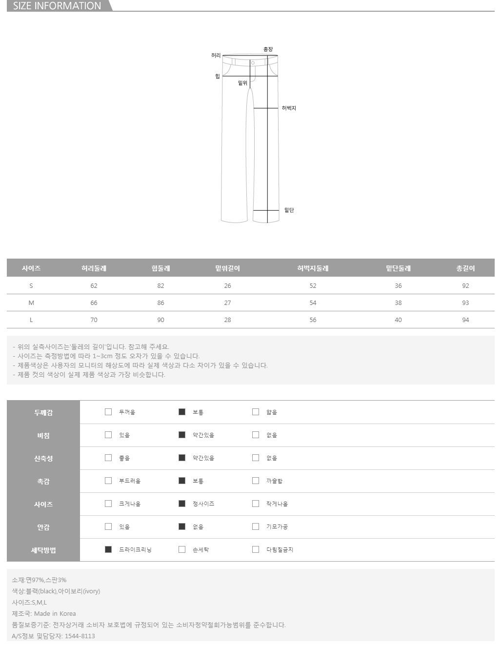 크로바 일자 팬츠 #74920MD COMMENT어디에나 잘 어울리는! 여유롭고 편안한 느낌의 데일리 팬츠 소개할게요캐주얼한 분위기를 입는 듯 베이직 하면서도 스타일리시한 포인트로매치하기 좋아 누구에게나 안성맞춤! 필수 소장 아이템이랍니다:) DETAIL TIP탄탄한 코튼 소재로 부드럽게 착! 하고 감겨 부담감이 없음은 물론 스판소재로 한결 편안하게 즐겨보실 수 있게 신경써주었다는 사실! 또한 깔끔한 베이직 라인으로 어떻게 스타일링 하느냐에 따라 워낙 다양한 매칭이 가능해 우수한 실용성까지 겸비했으니 it item~ 모델처럼 가볍게 롤업해서 연출해주셔도 멋스러워 하나쯤 소장하시면 코디하는 데에도 재미가 쏠쏠해 누구나 욕심낼 만한 아이템이랍니다:) 뛰어난 활용성을 지닌 컬러 구성으로 지금 바로 만나보세요-♡ COLORSIZE TIP컬러는 블랙아이보리 2color로 구성되어 있으며 모델의 착용 컬러는 아이보리/S 입니다.사이즈는 SML 사이즈로 진행되오니 고객님의 체형에 맞게 선택하셔서 예쁘게 착용하시길 바랍니다.