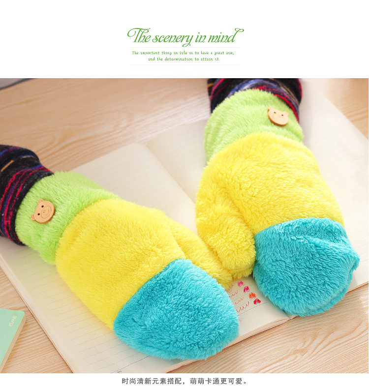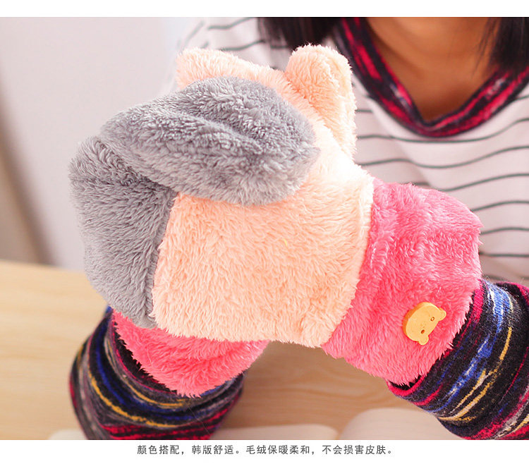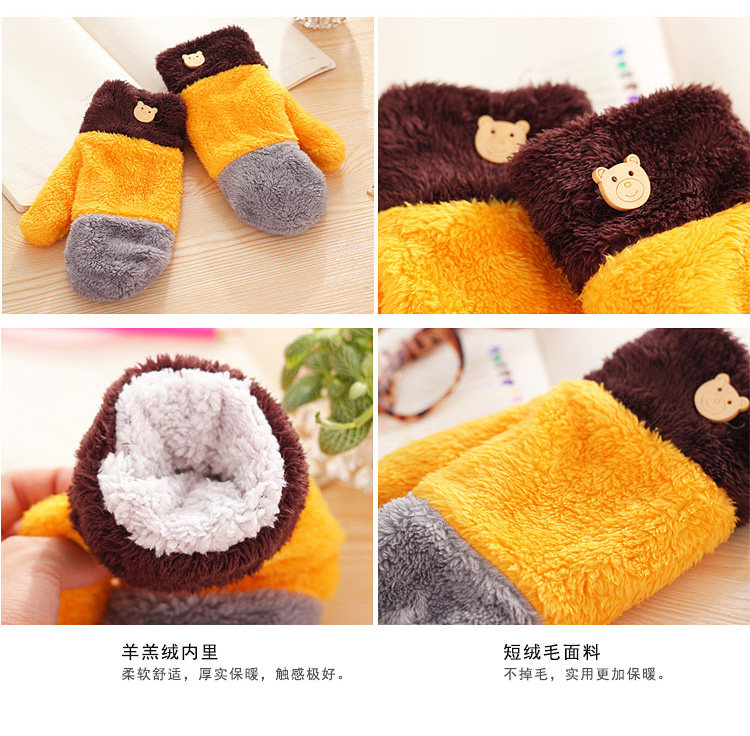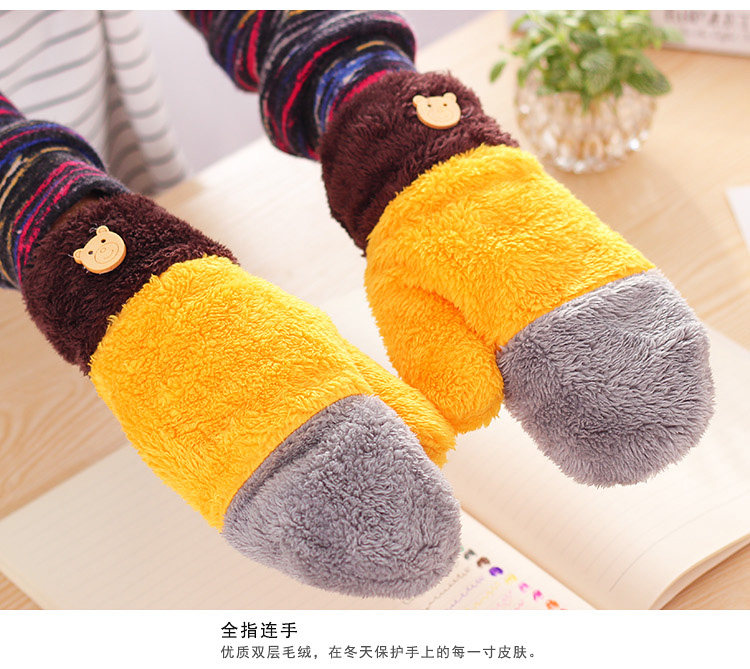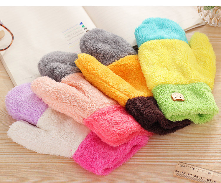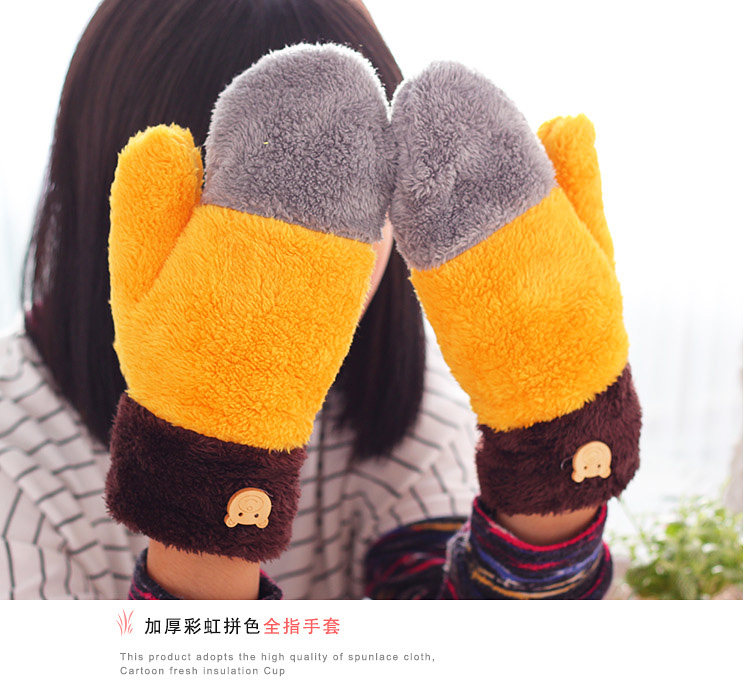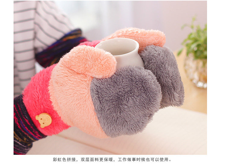 介绍:手套全身采用柔软长毛绒包裹,保暖性极佳,时尚拼色设