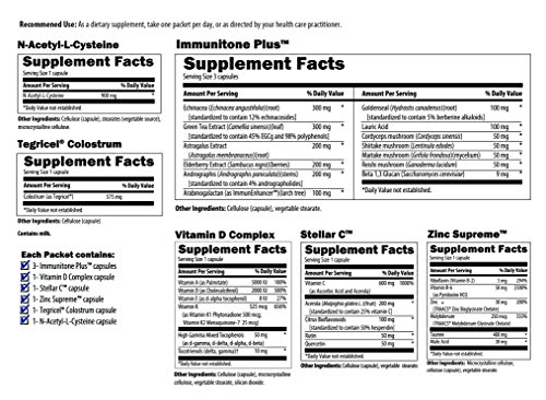 These packets contain a comprehensive arsenal of immune-supportive nutrients, helping the body maintain a strong defense. Products that comprise these packets were selected for their abilities to support the bodys overall immune response, providing the body with efficacious amounts of vitamin D (balanced with vitamins A, E and K, the remaining fat soluble vitamins), vitamin C, zinc, colostrum, and a wide array of antioxidants.
