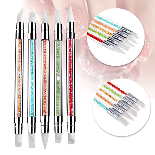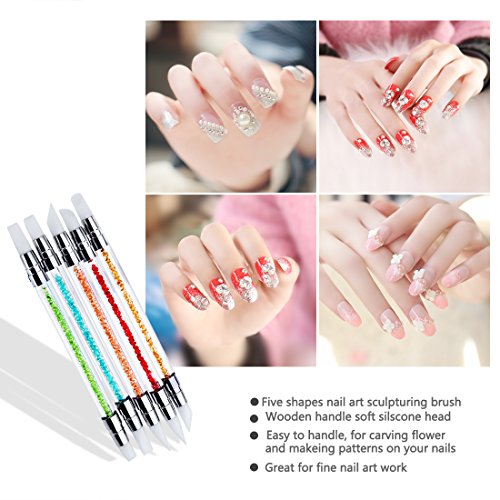 Biutee 5Pcs 2 Way Nail Art Sculpture Pen Silicone Rhinestone Polish Emboss Carving Drawing Handle Nail Art Brush Manicure Tool Set Silicone