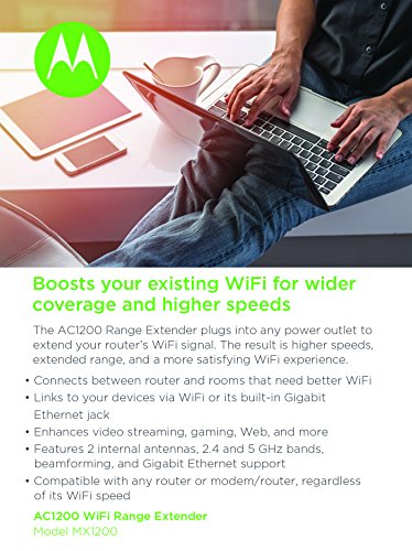 The MX1200 plugs into any US power outlet. It includes a Gigabit Ethernet port so that it even works with Ethernet-capable devices that don’t have WiFi capability.
