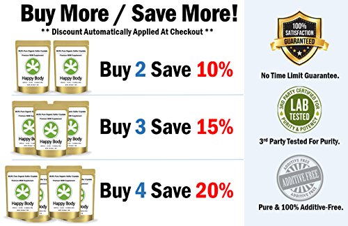 • Happy Body Organic Sulfur Crystals are premium, 99% pure MSM at minimum. No fillers. No Additives No binders.