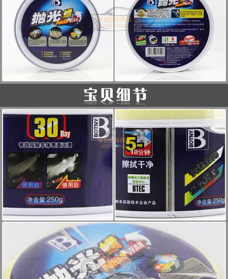 Trusted Botny bright polishing wax, effectively remove surface stains on the body, effectively preventing the oxidation of paint sun, pale color, care of the paint, bring a wonderful luster. After repeated testing, Botny adhere to choose high-grade soft waxy abrasive material polishing wax, but it contains unsaturated polyester ingredient in polishing while, take care of the paint. Value for money, highly respected.