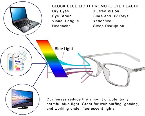 Product Description Blue light blocking reading glasses reduce eye strain, eliminate dry eyes, do not let your eyes uncomfortable ruin your daily life. this frame has a special color, clear light grey, looks like crystal, this frame is suitable for women and men. Light weight and super elastic material, comfortable to wear.