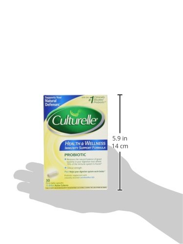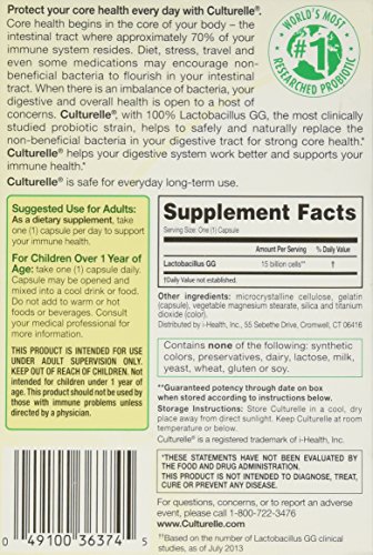 Culturelle Health & Wellness Probiotic 30 vegcaps Dietary Supplement Restores the natural balance of good bacteria in your digestive tract. Supports your healthy immune system. Helps your digestive system work better. Core health begins in the core of your body - the intestinal tract where approximately 70% of your immune system resides. Diet, stress, travel, and some medications may cause occasional imbalance of the good and non-beneficial bacteria in the digestive tract. Culturelle, with 100% in Lactobacillus GG, the most clinically studied probiotic strain, helps to safely and naturally restore the balance of good bacteria in your digestive tract for strong core health. Culturelle helps your digestive system work better and supports your immune health. Directions: For use as a dietary supplement, take one capsule per day to support your immune health. Supplement Facts Serving Size: One (1) Capsule Amount Per Serving Calories 0 Sugar 0 Vitamin C (as sodium ascorbate) 3 mg Lactobacillus GG: 15 billion CFU's Other ingredients: microcrystalline cellulose, hydroxypropyl methylcellulose, sucrose, maltodextrin, magnesium stearate, titanium dioxide (color), and silicon dioxide. **Guaranteed potency through date on box when stored according to instructions below. Storage Instructions: Store Culturelle in a cool, dry place away from direct sunlight. This product is intended for use under adult supervision only. Keep out of reach of children. Not intended for children under 1 year of age. This product should not be used by those with immune problems unless directed by a physician.Feature