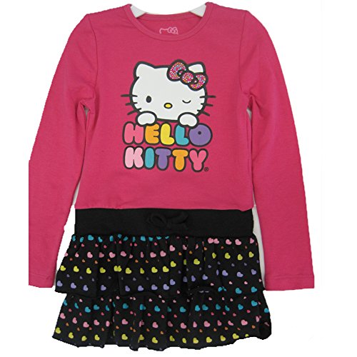 A fancy casual dress with the famous Hello Kitty face printed, a studded bow and glittery texture. The long sleeved dress has a fuchsia top with, Kitty print and a black heart printed layered skirt with a little bow at the waist. Your girl will surely enjoy this comfy yet pretty dress.Feature