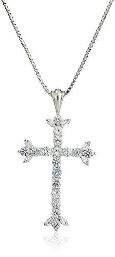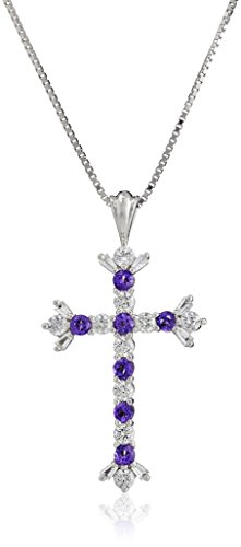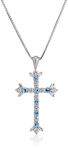 -. Binding : Jewelry -. Brand : Amazon Collection -. Department : womens -. Feature : Sterling silver cross pendant with alternating gemstone and Created White Sapphire gemstones / Gemstones may have been treated to improve their appearance or durability and may require special care. / The natural properties and composition of mined gemstones define the unique beauty of each piece. The image may show slight differences to the actual stone in color and texture. / Imported -. Label : Amazon Collection -. Manufacturer : Amazon Collection -. Model : P34043BTSSCW-Parent -. ProductGroup : Jewelry -. ProductTypeName : FINENECKLACEBRACELETANKLET -. Publisher : Amazon Collection -. Studio : Amazon Collection -. Title : Sterling Silver Gemstone and Created White Saphire Cross Pendant Necklace, 18"