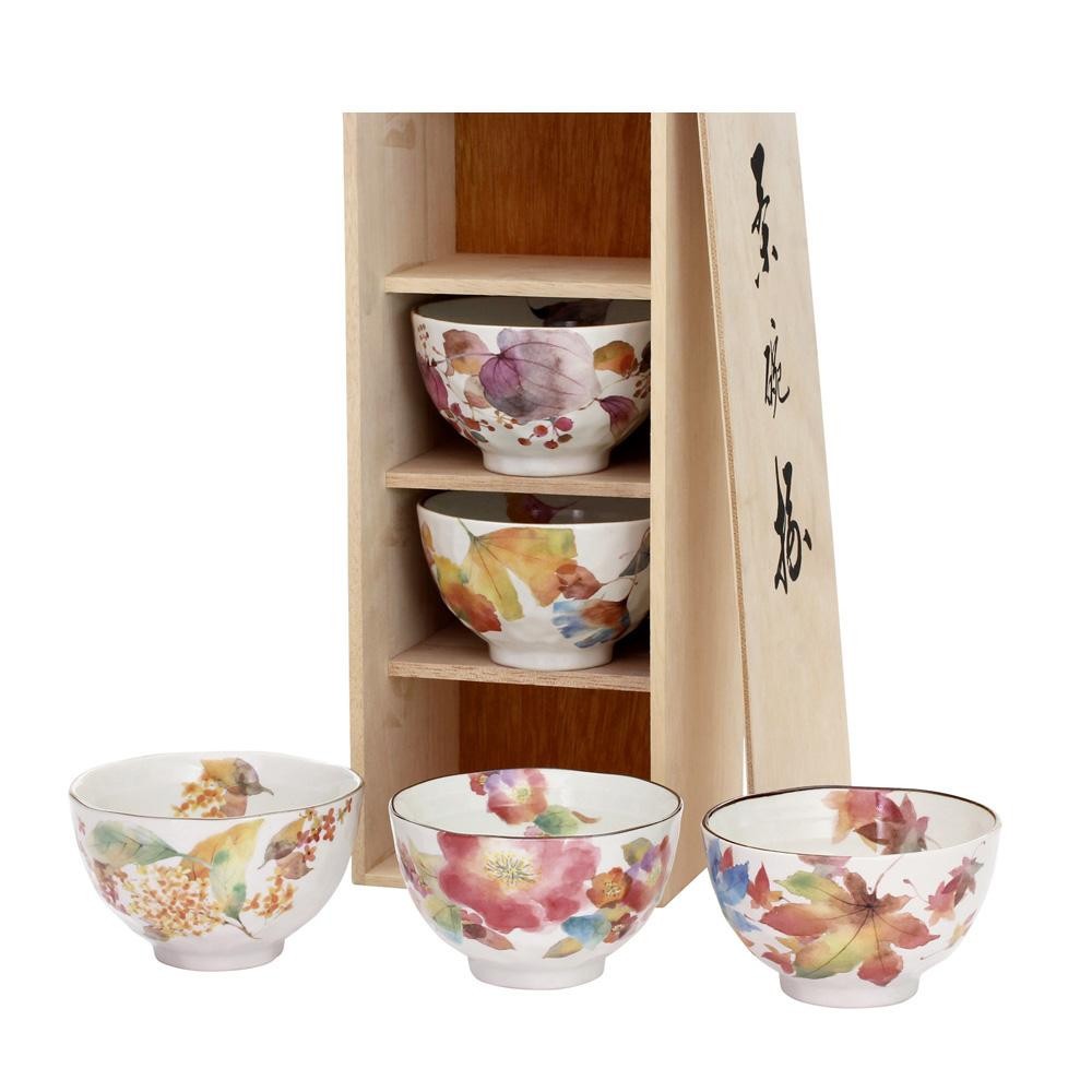 山茶花、紅葉、山帰来、金木犀、銀杏が色とりどりに描かれた5つの飯碗を木箱に入れたギフトセットです。