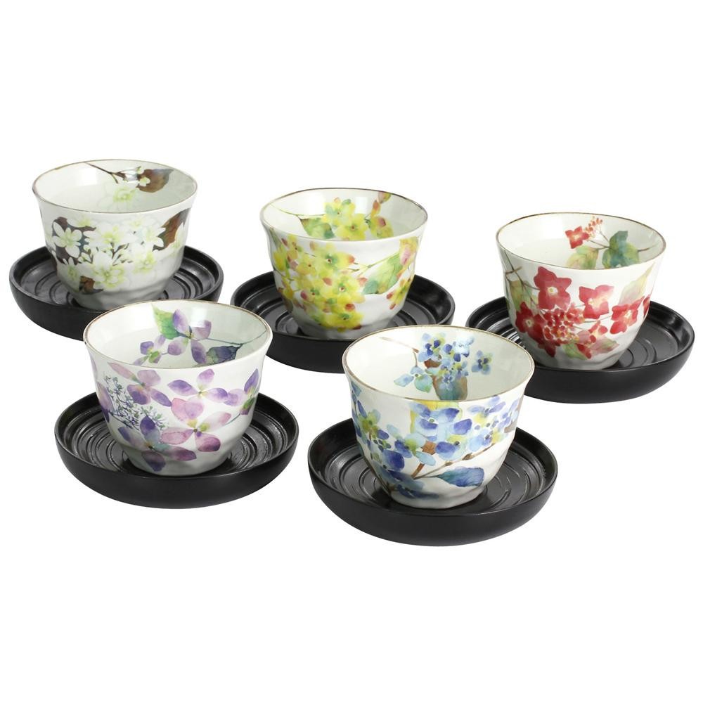 色とりどりの紫陽花を描いた煎茶碗と茶托の5客セットです。大切な方へのギフトとしても最適です。