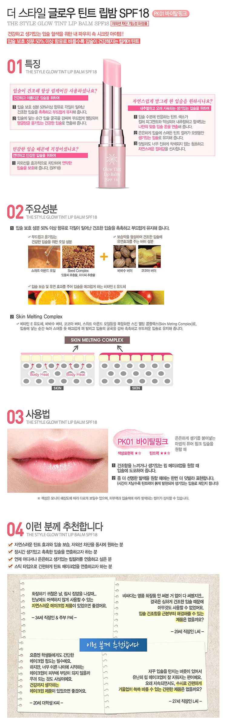 元気でフレッシュな唇のためのアイテム! 唇保護成分を50%以上含み、塗るたび唇がケアされるリップティント。 【カラー】 PK01バイタルピンク 【商品構成】 ザ・スタイルグローティントリップバーム1個 4.1g