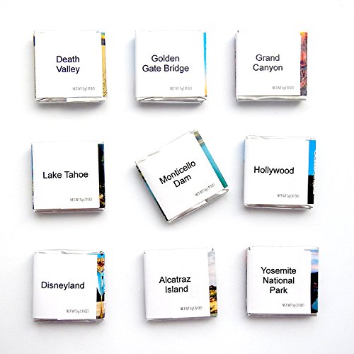 -. Feature : Pieces of chocolate made from high-quality raw. / Gift set has a MAGNET on it's backside so you can hang it on your fridge. / Each of the 9 wrappers contains one of California attractions / Death Valley, Golden Gate Bridge, Grand Canyon, Disneyland / Lake Tahoe, Monticello Dam, Hollywood, Alcatraz Island, Yosemite National Park