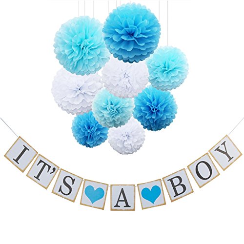 U-Goforst It is a Boy Vintage Baby Shower Paper Garland Bunting Banner and 9 PCS Tissue Pom Poms Decoration Birthday Party Favor Photo Booth (Boy)