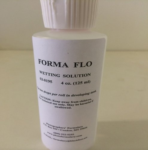 Formaflo Solution decreases water surface tension; takes away water streaks on film and aids film in drying faster. Use 4 drops per roll of film, do not squeegee.