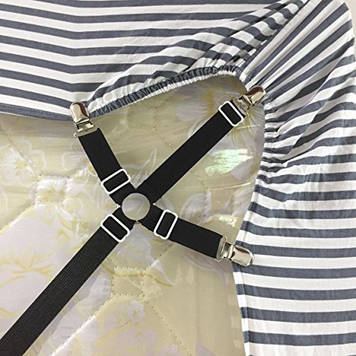 Adjustable length- All straps are adjustable. Works with all types of bed sheets, fitted sheets, flat sheets ,mattress pads,sofa,table,baby's cribs and more.