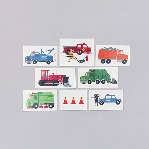 Our new Traffic Set is a collection of our favorite vehicles by Ed Miller. Let these cars and trucks run wild on your skin. Each set includes 8 Tattlys and comes packaged in our new card stock sleeve with a full-color photo on the front. Designs in the Traffic Set are: Fire Truck, Plow Truck, Police Car, Rock Mover, Sanitation Truck, Street Sweeper, Tow Truck, and Traffic Cones.Feature