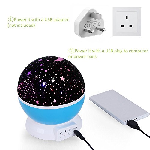 Fancy Design --- Stars and moons can be projected on the walls and ceiling. There are a lot of different options for colors and amount of star projected. It makes a romantic and dreamlike atmosphere. No matter what your age this is the perfect help you sleep night light or just night time light.
