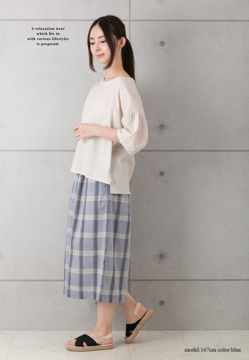 一面に落ち着いた色調のチェック柄を浮かべた、カジュアル&シックなガウチョパンツ。スカート見えするワイドシルエットが女の子らしい♪締め付けのないドロスト仕様のゴムウエストで、リラックスした穿き心地が叶います。