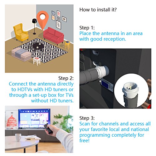 Step 1: Place the HDTV antenna in an area with good reception. Step 2: Connect the antenna directly to HDTVs with HD tuners or through a set-top box for TVs without HD tuners. Step 3: Scan for channels and access all your favorite local and national programs completely for free.