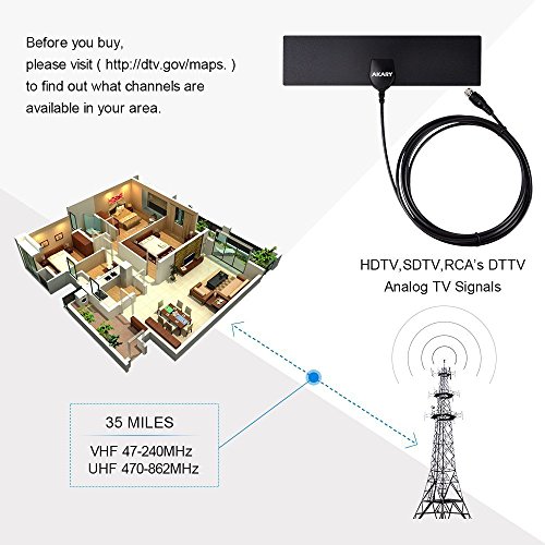 1. Only free channels are accessible - AKARY antenna can't access to paid channels. 2. Channel reception will vary based on what is broadcasted in your area, your distance from broadcast towers, and any geographical obstructions between you and the towers. Before you buy this antenna please enter your zip-code or address on the website to check the available TV reception in your location. 3. This Antenna can pick up signals from 35 miles range. Make sure your distance to the nearest TV station is within this range. 4. Remember to re-scan for TV channels after moving the TV antenna, sometimes moving a few feet can make a difference. 5. Extreme weather like thunderstorms may affect the signal reception. Run a re-scan after the storm if the signal doesn't come back after the storm.