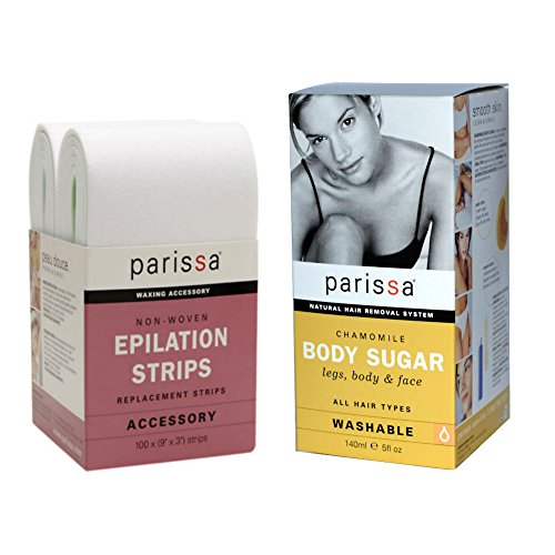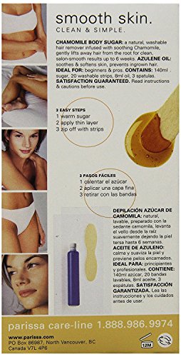 Studio : Parissa Publisher : Parissa Binding : Misc. Product Description Chamomile Body Sugar: a natural, washable hair remover infused with soothing Chamomile, gently lifts away hair from the root for clean, salon-smooth with results up to 6 weeks. Includes vial of Azulene Oil to soothe soften skin and prevent ingrown hair. Works in 3 Easy Steps: 1. warm sugar 2.apply thin layer 3. zip off with strips. Ideal for both beginners pros. Also included in this bundle are 100 Non-woven Epilation Strips, the perfect compliment to Parissa Chamomile Body Sugar to keep you fully stocked. Sturdy and non-woven for use with all hair removal waxes and sugars. Soft to touch, yet strong enough to use anywhere on the body. 0