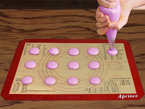 - HIGHEST QUALITY FDA and LFGB Certified BAKE WARE SET With Standard Macaron Patterns; The big circles are 45mm in diameter for Standard Macaron Sized. The small circles are 35mm in diameter, help center the piping bag. THE MAT COMES WITH EXTRA HELPFUL CHARTS PRINTED (WEIGHT,VOL,FLUID TABLE,& TEMP CHART) : Premium nonstick silicone baking mat, Best in class quality, reusable over 4000 times! Fits perfectly in a half sheet sized baking pan 29.5cm x 42cm