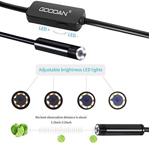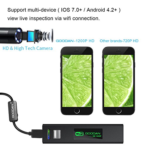◆High Resolution Camera: Featuring with 2 Megapixels 1200P HD camera, this endoscope offers you a wonderful experience of recording a clear close range HD video in AVI format and snapshot image in JPG format with three adjustable resolutions 640 x 480, 1280 x 720, 1600 x 1200, take off the semi-rigid endoscope camera cable with USB port to charge the GOODAN wifi box, That is more convenient and safety than charge other brand’s wifi box and intergrated semi-rigid cable, Tidy the power strip