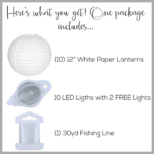 WHATS INCLUDED? Each order includes Ten (10) 12 Inch in diameter Just Artifacts® brand Round Hanging Paper Lanterns, Twelve (12) battery operated LED lights (batteries included) and one (1) 30yrd spool of clear fishing line for hanging *LED lights last 24-36 continuous hours and have on/off switch