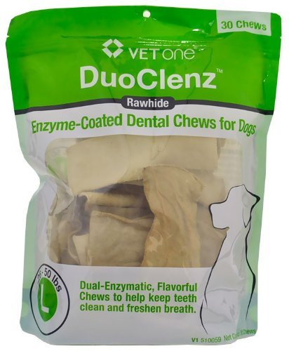 -. Binding : Misc. -. Brand : Vet One -. EAN : 0313985010101 -. Feature : VetOne DuoClenz EnzymeCoated Dental Chews Large (30 count) / Dual-Enzymatic, Flavorful Chews to help keep teeth clean and freshen breath / Help prevent plaque and tartar build-up and keep the teeth clean / The palatable poultry flavor / Quicker acting results over a chew impregnated with enzymes -. Label : Vet One -. Manufacturer : Vet One -. Model : 313985010101 -. MPN : 313985010101 -. PackageQuantity : 1 -. PartNumber : 313985010101 -. ProductGroup : Pet Products -. ProductTypeName : PET_SUPPLIES -. Publisher : Vet One -. Size : 30 count -. Studio : Vet One -. Title : VetOne DuoClenz Enzyme Coated Dental Chews Large (30 count) -. UPC : 313985010101