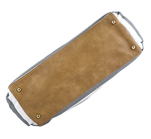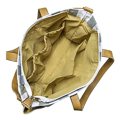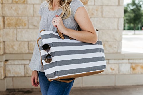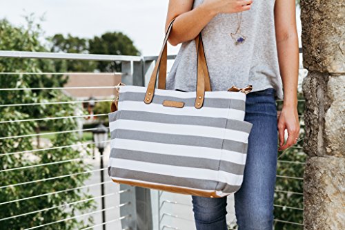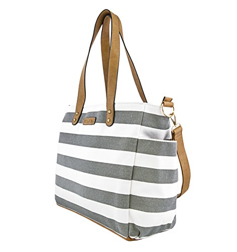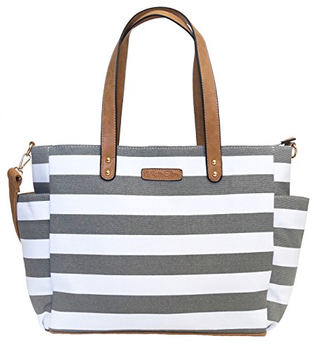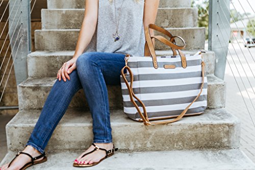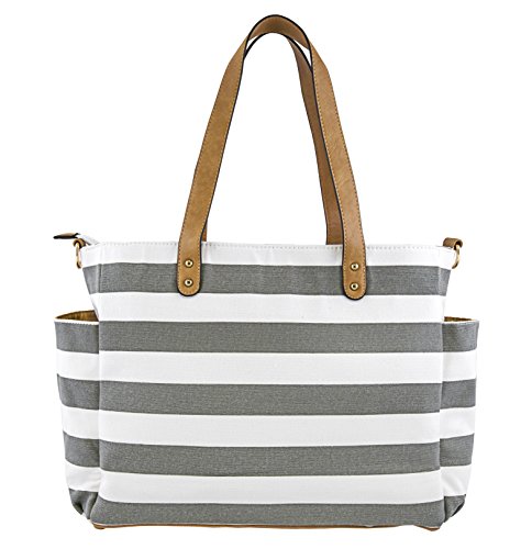 -. Title : Gray Stripe Tote Bag by White Elm -The Aquila - Canvas & Vegan Leather, Zipper Closure & Crossbody Strap