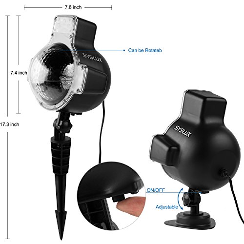【IP65 Waterproof Outdoor】- Syslux Snowflake Motion Projector is built to withstand the weather. Whether there's rain or snow, you can make your home sparkle any time. But please DO NOT put the light underwater or soak the light in heavy rain. With the waterproof safeguard, it is great for decorating your garden, house, fence, bush, tree, etc, making an outstanding light show among your neighborhoods