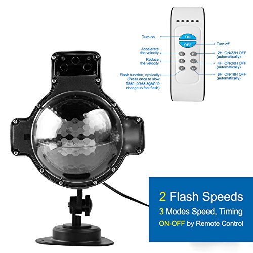 【RF Remote Control】- Multi-functional remote control (Battery Included), With our wireless RF controller from up to 50ft away, you can change different modes such as Button "F"--Flash Setting, Strobe or Normal Mode can be applied to Led Flurries Lights. Button "S+/S-" for Speed Up/Down. Button "2/4/6H" for Timer, Sets the waterproof garden projector light on a 2/4/6 Hours on, 22/20/18 Hours off Daily Cycle
