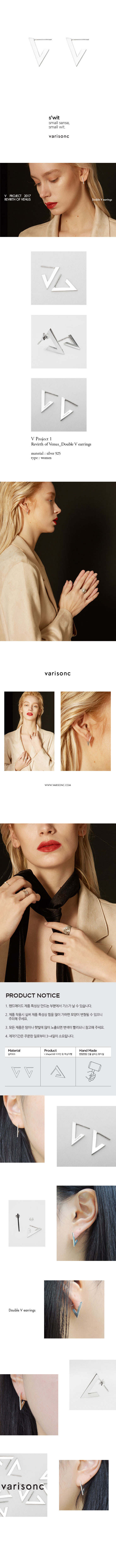 - 주문시 유의사항 : - 제작기간은 주문한 일로부터 3~4일이 소요됩니다. - 핸드메이드 제품 특성상 만드는 부분에서 기스가 날 수 있습니다. - 실버제품 특성상 힘을 많이 가하게 되면 모양이 변형될 수 있으니 주의해 주세요. - 제주 및 도서산간 지역은 추가배송비(3,000원)가 부과됩니다. Revirth of Venus_Double V earrings 삼각형은 가장 단순한 도형이자 모든 도형의 기본이 됩니다. Double V Earrings은 잠재력을 지닌 역삼각형의 형태에서 착안한 베리송크의 V에 여백을 주어 ‘영원한 잠재력의 발산’을 상징합니다. 스터드 형식으로 귀에 착용하는 제품으로 V shape으로 디자인된 실버 스터드가 귀에 수직으로 착용되는 제품입니다.