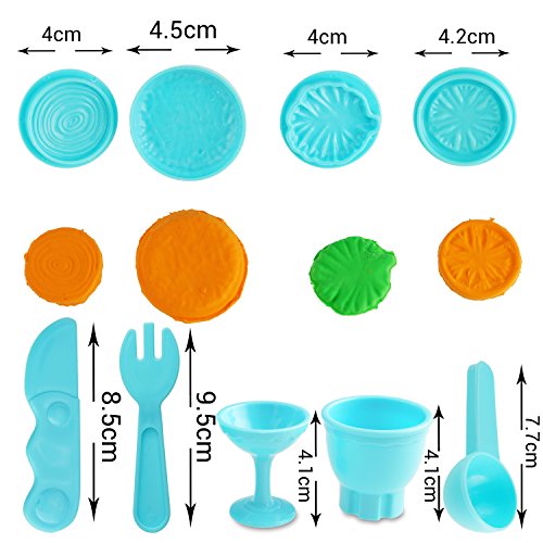 - Feature : This whole set of 19pcs Dough tools with ice cream, food and fruit set. Give you plenty of inspiration to mold and extrude lots of fun shapes and exciting creations! All of them are assorted color. / Created by experts, ideal for early learning at home, daycares or classrooms; Enrich children's imagination. / The 7pcs of ice cream set - this set comes with 1 Ice cream maker, 2pcs rails with 10 different shapes and 4pcs cups. Crank out pretend "ice cream" with this ice cream maker. / 12pcs of food and fruit set. This creative food and fruit set comes with apple, Orange, fish making mold, 6 small different shape mold, 2 cups and 1 spoon making your special Play-Doh-style "food and fruit" has never been more fun! / With Kare and Kind retail package