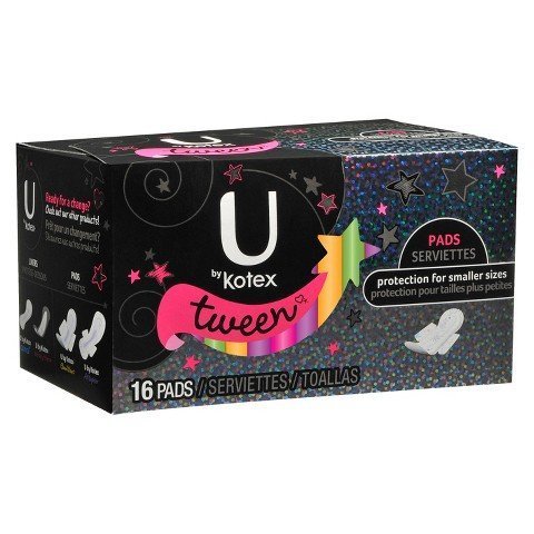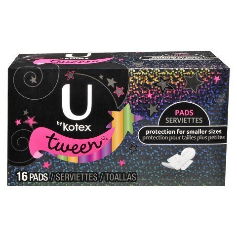 Studio : Illuminations Publisher : Illuminations Binding : Health and Beauty Product Description 1 Box of U by Kotex Tween Pads - 16 count Planning for your or a daughter's first period is easier with U by Kotex Tween Pads with heavy absorbency. Feminine pads are perfect for girls just learning about what it's like to have a period. This ultra thin period pad is smaller, shorter and narrower than our regular Ultra Thin Pads and are designed with vibrant colors and cool patterns. The unique Tru-Fit wings help keep the sanitary pad in place to prevent bunching and scrunching, so tweens stay fresh and dry. Periods can start anytime and anywhere, so make sure you keep a few period pads with you at all times. U by Kotex pads for teens are latex-free, lotion-free and fragrance-free and come individually folded and wrapped in three bright and bold styles to escape boring period protection. If you're ready or want to help a daughter transition to a different style of protection, try U by Kotex Click Tampons. These tampons are compact in size and come in three absorbencies so you can easily slip one into your purse or pocket. 0