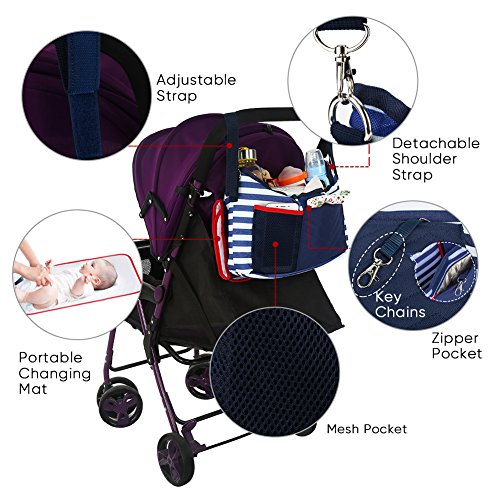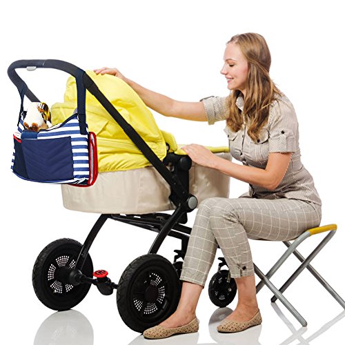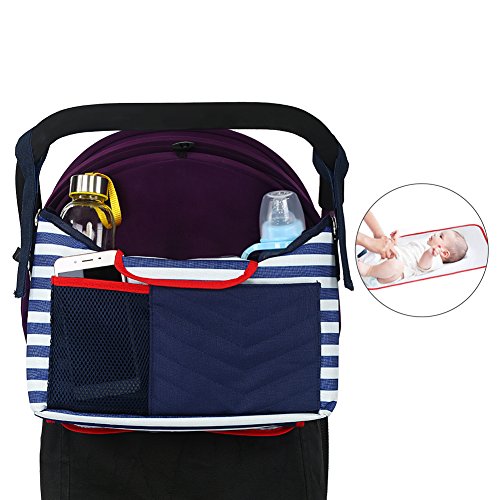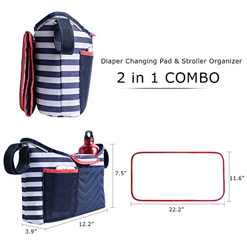 Product Information: ? Compatibility: Universal design fits most baby strollers on the market ? Material: Waterproof Polyester Fabric ? Color: Blue and White Stripes ? Organizer's Size: 12.2in x 7.5in x 3.9in ? Diaper Changing Pad's Size: 21.7in x 11.4in