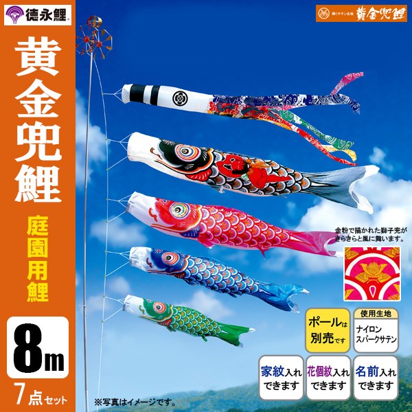こいのぼり/鯉のぼり 庭園用(ポール別売りになります)(家紋入れ・名前入りは別料金になります)鯉のぼり 室内用 鯉のぼり ポール 鯉のぼり マンション 鯉のぼり 庭 園用 鯉のぼり 手作り 久月鯉のぼり 鯉のぼり ポール 鯉のぼり 徳永 取扱(セット内容)・吹流し8m・黒鯉8m・赤鯉7m・青鯉6m・緑鯉5m・矢車一式・ロープ35m黄金兜鯉 光沢あるスパークサテン生地を使用し、鱗に金粉を用いて黄金兜柄を描きあげた豪華な鯉のぼりです。真鯉(黒鯉)には、両面にたくましく金太郎を描きました。吹流しはスパークサテン生地を使用し、雲と波の五色柄に縁起よく昇龍を描いた「雲龍吹流し」。五月の空にきらきらと輝き泳ぐ黄金兜鯉の姿はひときわ華やかです。