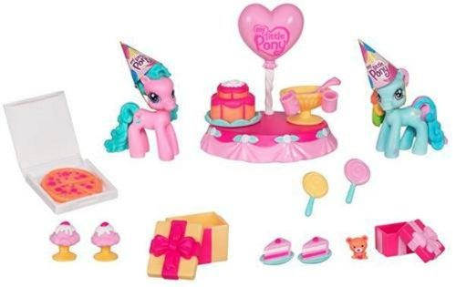 -. Feature : Get ready to celebrate a birthday - pony style! / Includes 2 pony figures, 2 ice cream sundaes, 2 lollipops, pizza, 2 gift boxes, teddy bear, 2 pieces of cake, 2 party hats, table, punch bowl, ladle, 2 cups, cake and balloon. / Small parts - not for children under 3 years.