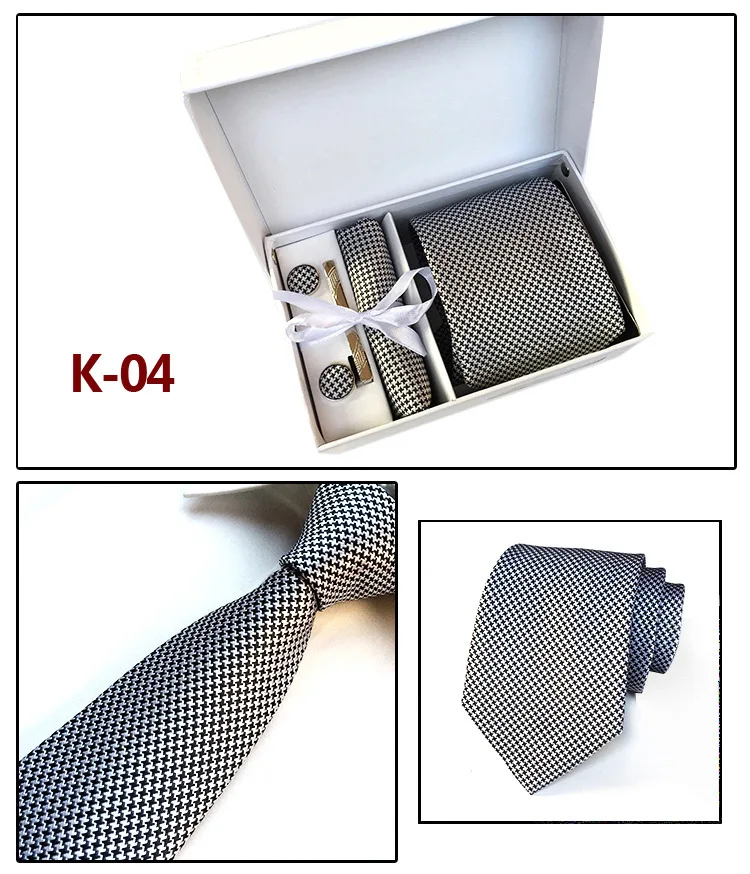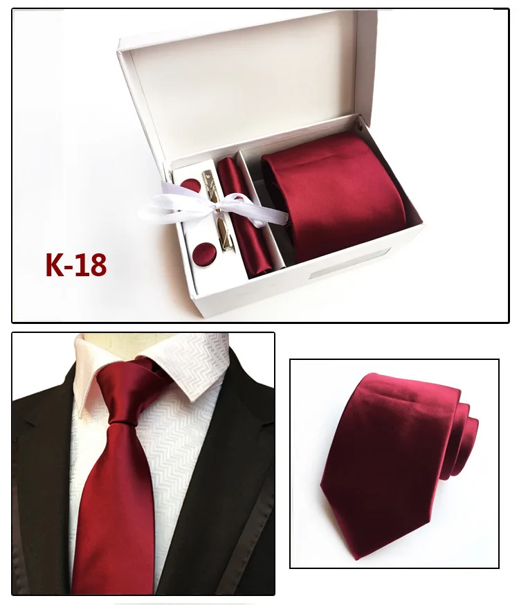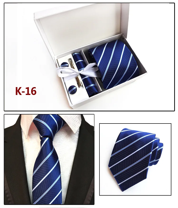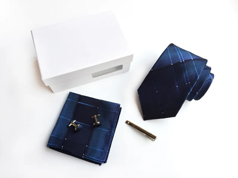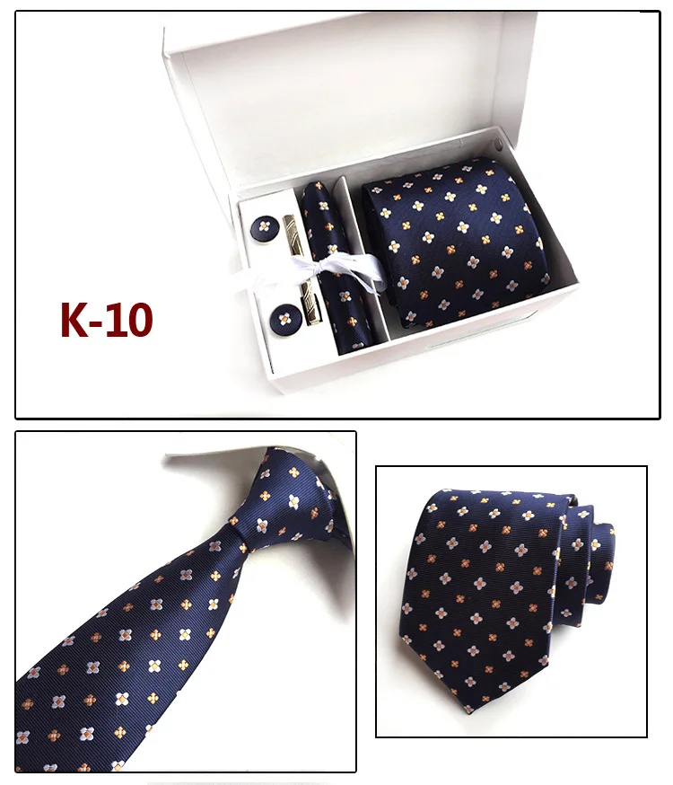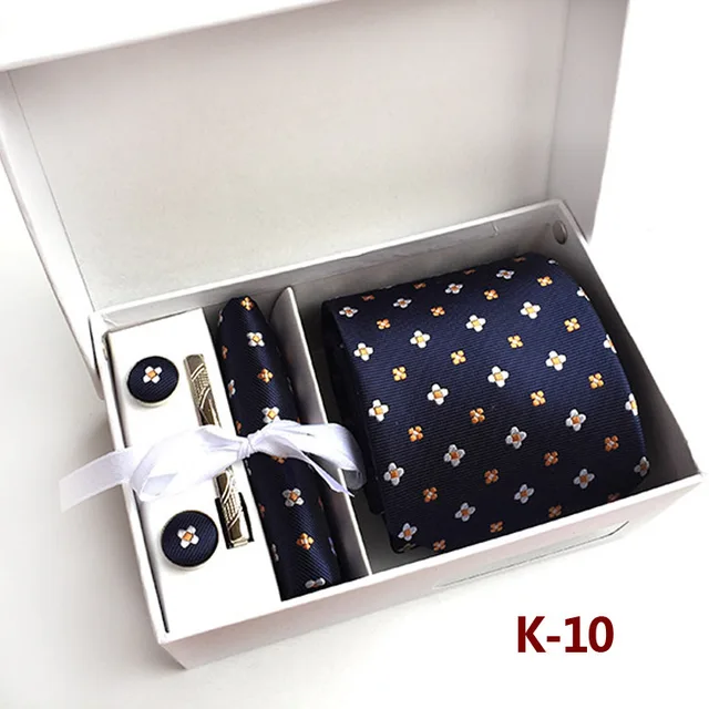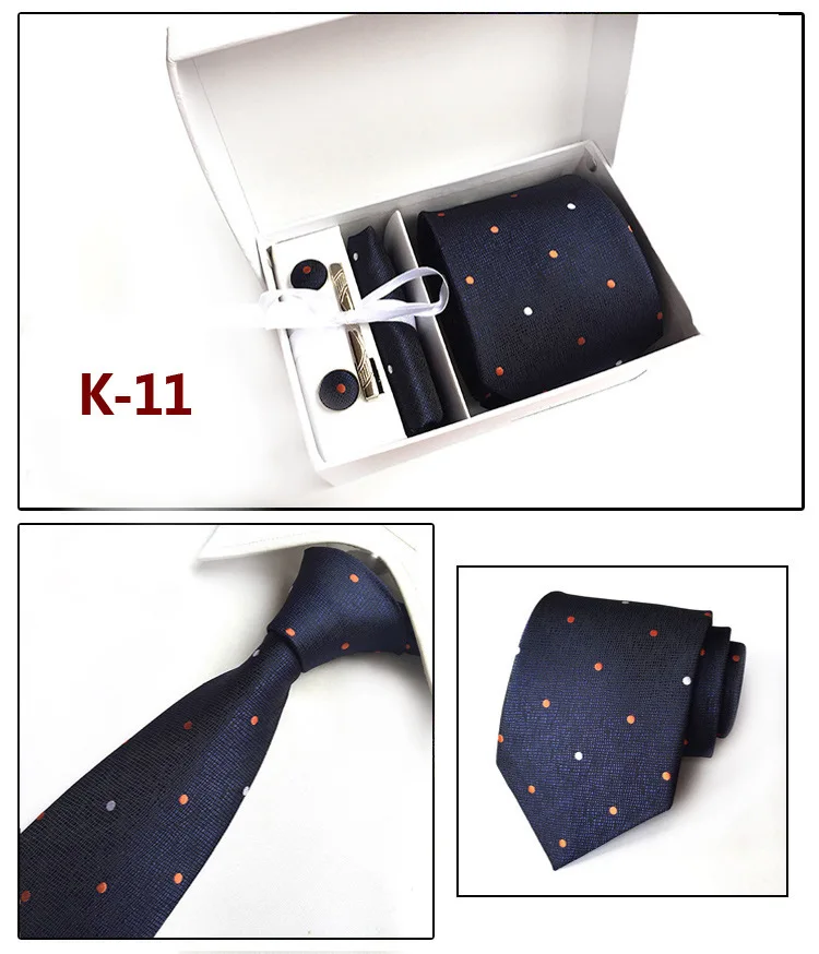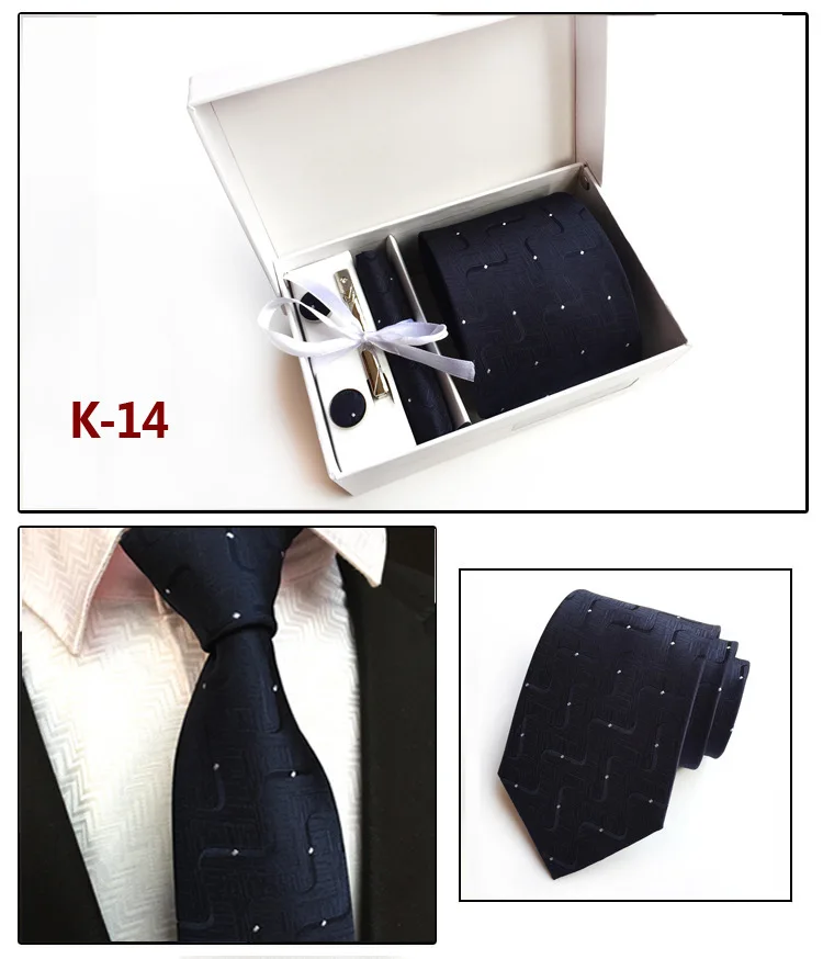 상품 내용 넥타이 세트, 선물 세트 포함, 스카프, 커프스, 넥타이 클립,, 핸드백 넥타이 크기: 148x8x3.5 센치메터 광장 크기: 25x25 센치메터 커프 크기: 1.6 센치메터 상자 크기: 16x10.5x7 센치메터 포장 상세
