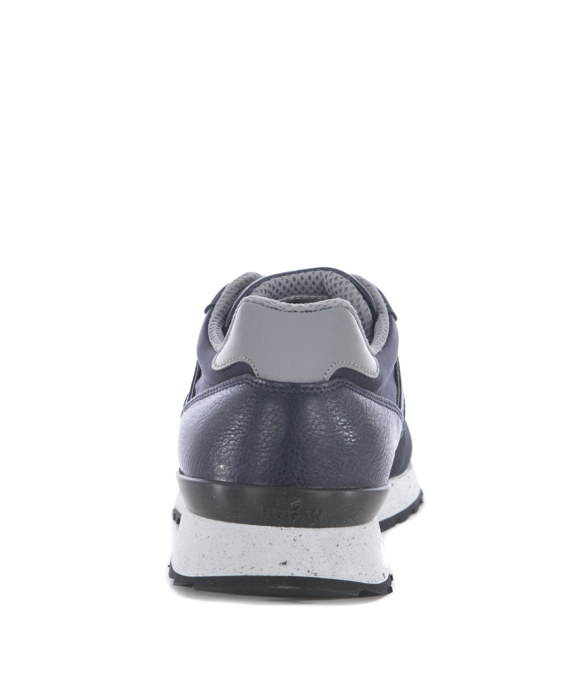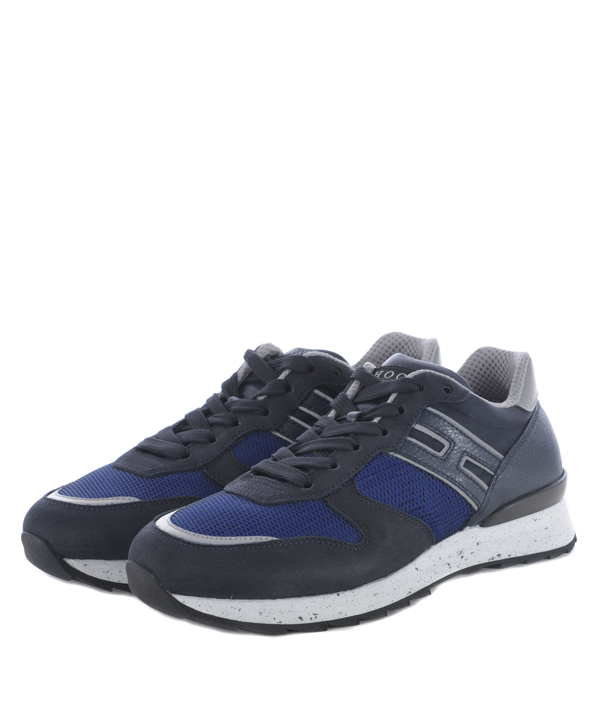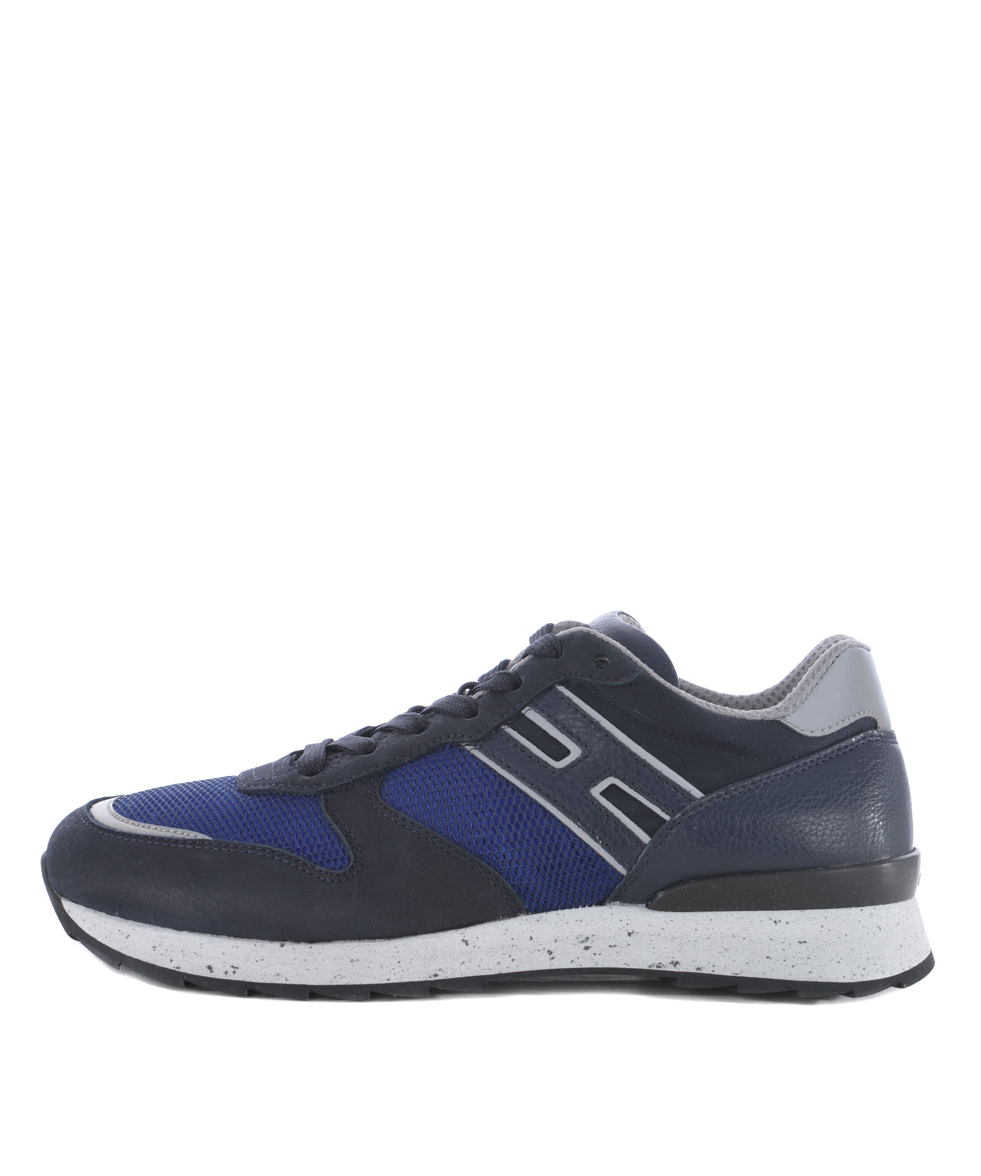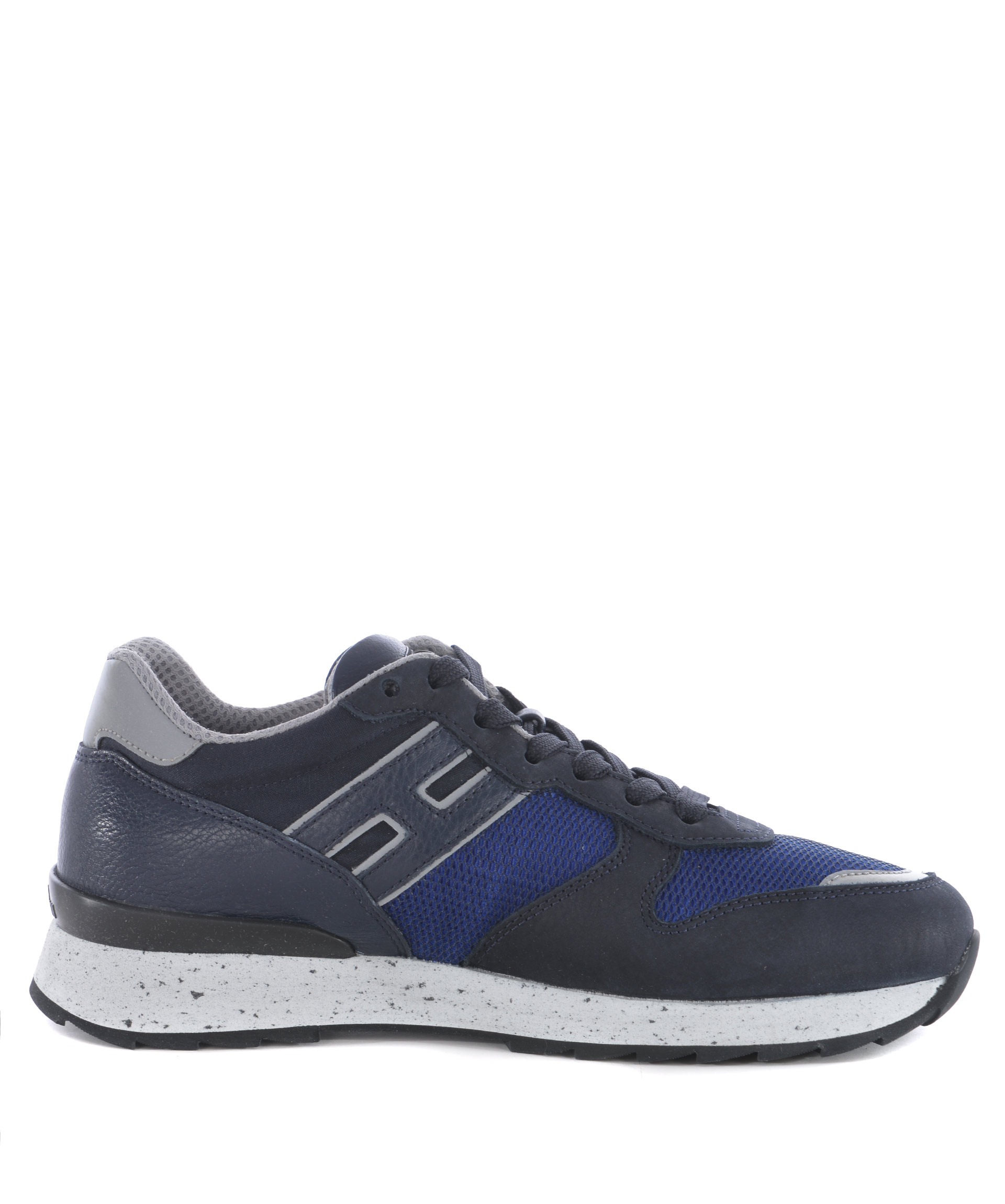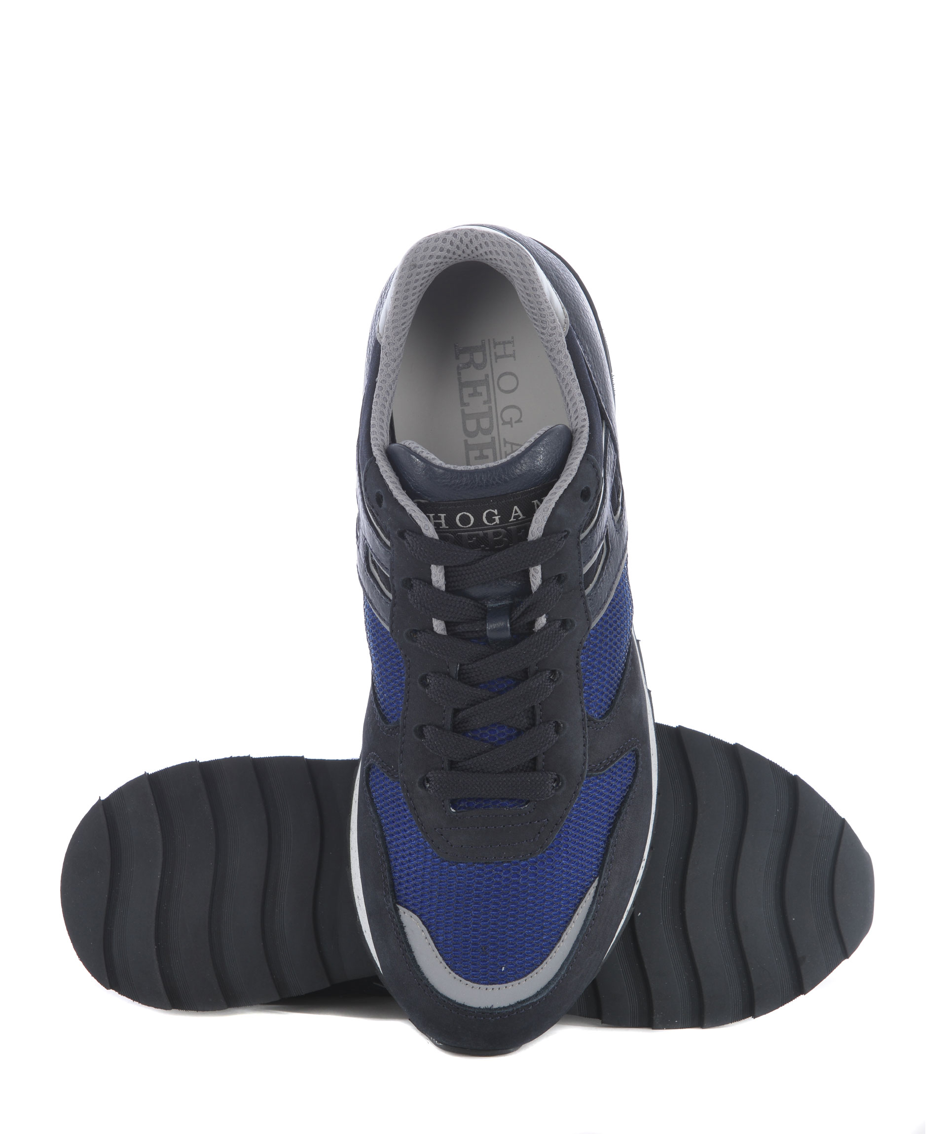 Sneakers uomo Hogan Rebel in nabuk Blu scuro e nylon a rete Blu cobalto. H laterale in pelle. Inserti in pelle. Inserto reflective alla punta e sul retro. Stringate. Patch logo applicata sulla linguetta. Suola 30 mm in gomma puntinata.